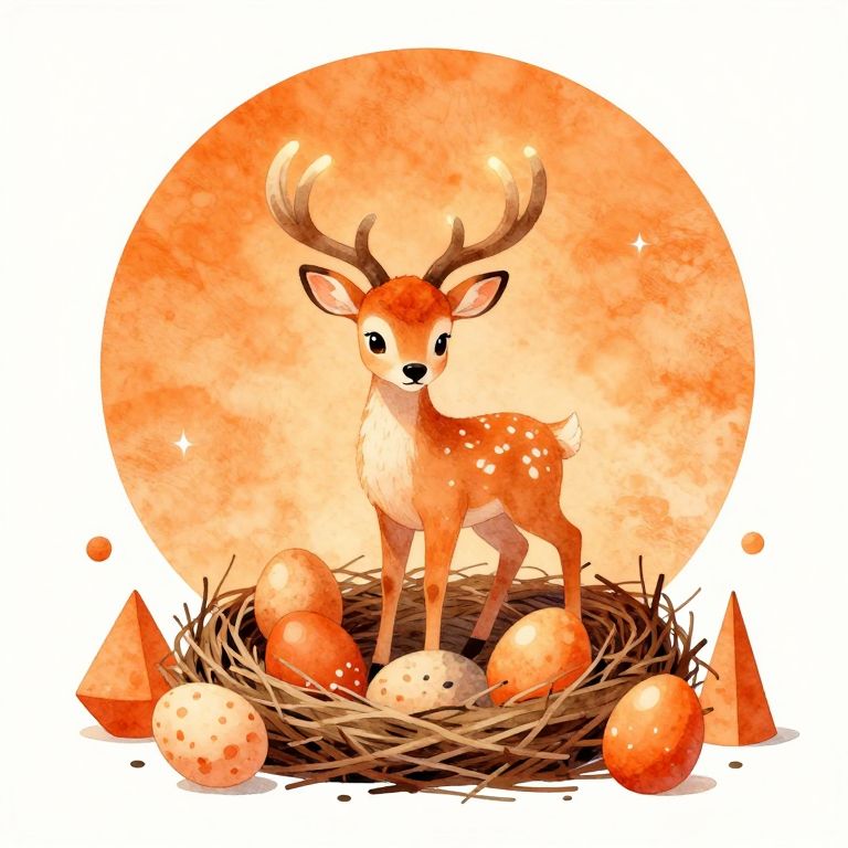 The image depicts a magical, tiny baby stag with glowing antlers, standing on a nest filled with easter eggs. The stag is rendered in a vibrant orange color, evoking a sense of warmth and enchantment. The background is a large, isolated orange circle, creating a striking contrast with the stag's figure. Surrounding the nest are several small, orange geometric shapes, including spheres and cones, adding to the whimsical and fantastical atmosphere. The overall composition is balanced, with the stag centrally positioned and the easter eggs and geometric shapes arranged in a harmonious manner, creating a sense of depth and dimension. The Japanese watercolor style is evident in the soft, blended textures and the use of warm, earthy tones, enhancing the dreamlike quality of the scene.