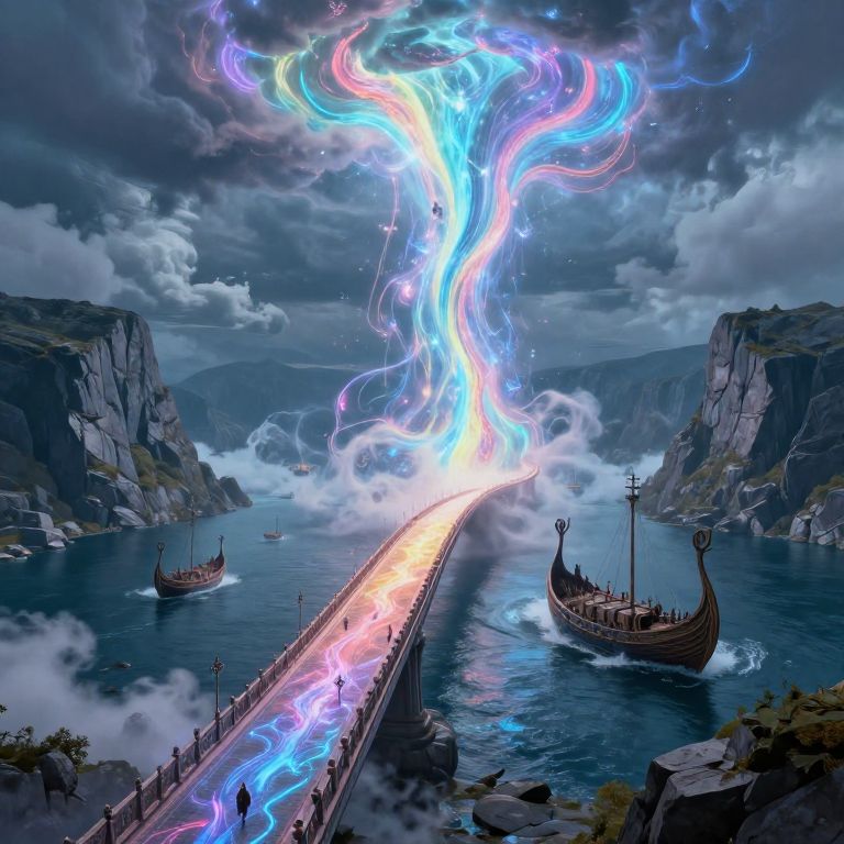 Digital artwork of a glowing, ethereal bridge connecting two rocky mountainous shores, with colorful, swirling lights and Viking ships.