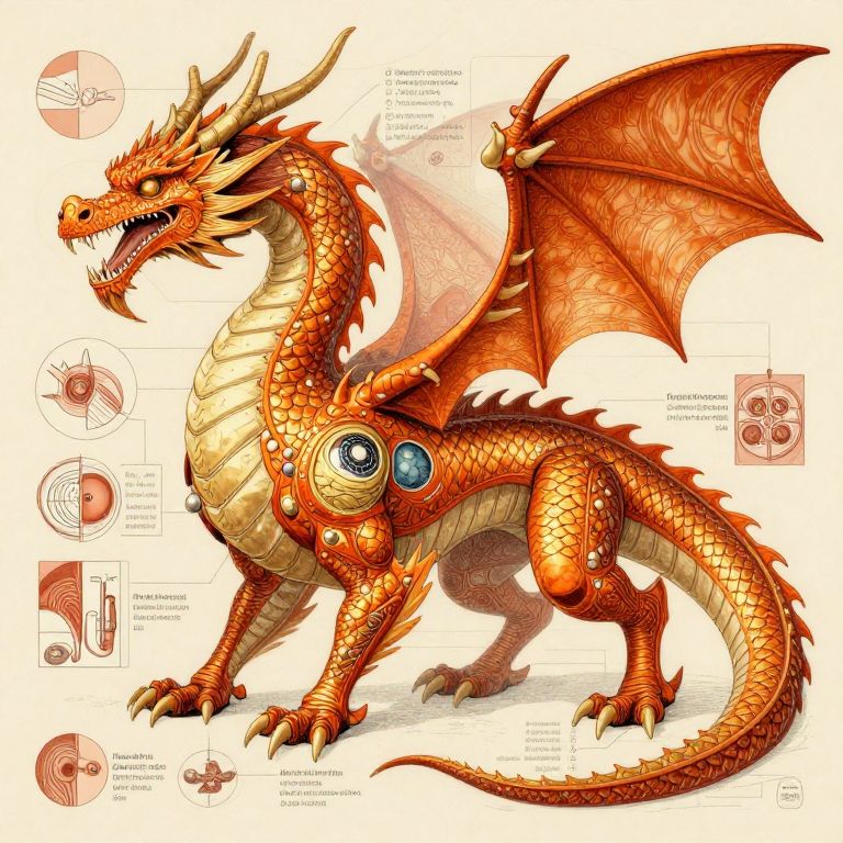 A highly detailed, anatomical cutaway diagram of a large orange and gold medieval fantasy dragon, featuring intricate medical and infographic elements, presented in a retro style with Japanese and risograph influences, reminiscent of manga and screenprint art.