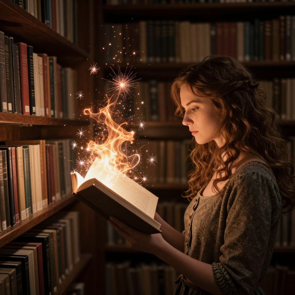 In a dimly lit library filled with rows of books, a woman engrossed in reading holds an open book that bursts with fiery sparks, evoking a magical and ethereal atmosphere reminiscent of fantasy art, where each page seems to ignite with the power of imagination.