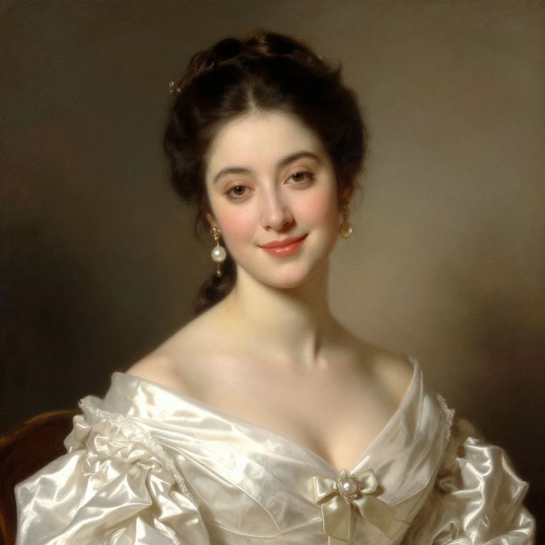 Portrait of an aristocratic beauty in vintage oil painting style, soft diffused lighting on luxurious satin gown and pearl earrings, captured with refined expression and a subtle hint of a smile