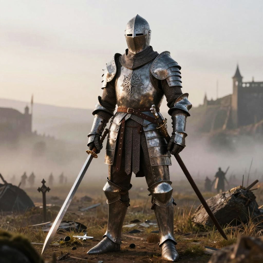 A medieval knight, wearing shining armor with a red cape, walking through a castle courtyard at dawn, surrounded by swaying banners and fluttering doves, drawn in the dreamy and reflective style of Naji Yanagida.