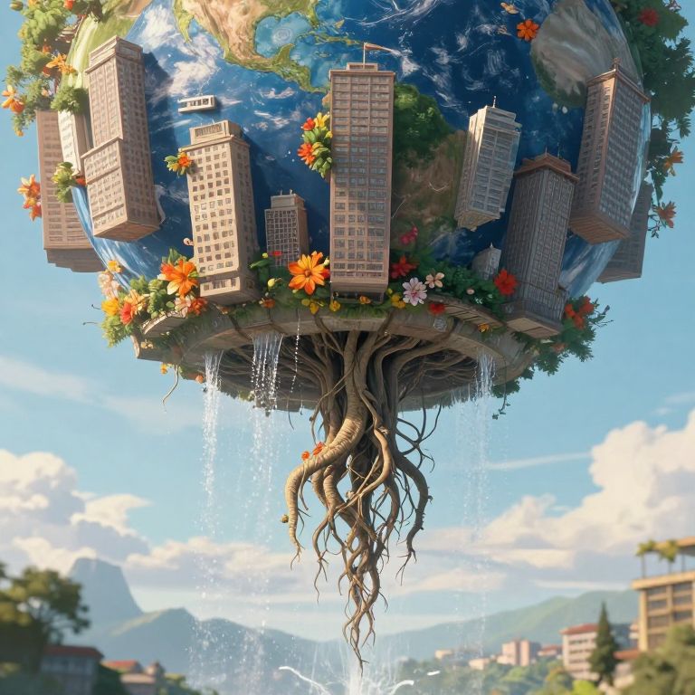 Digital CGI artwork depicting a surreal floating cityscape. Earth floats in the sky, with skyscrapers and buildings adorned with vibrant orange and red flowers. The city is suspended by thick, intertwining tree roots, with water droplets falling from them. The background features a bright blue sky with fluffy white clouds and distant, blurred buildings and mountains. The Earth's surface displays detailed continents and oceans. The image blends realistic textures with fantastical elements, creating a whimsical, nature-integrated urban scene.