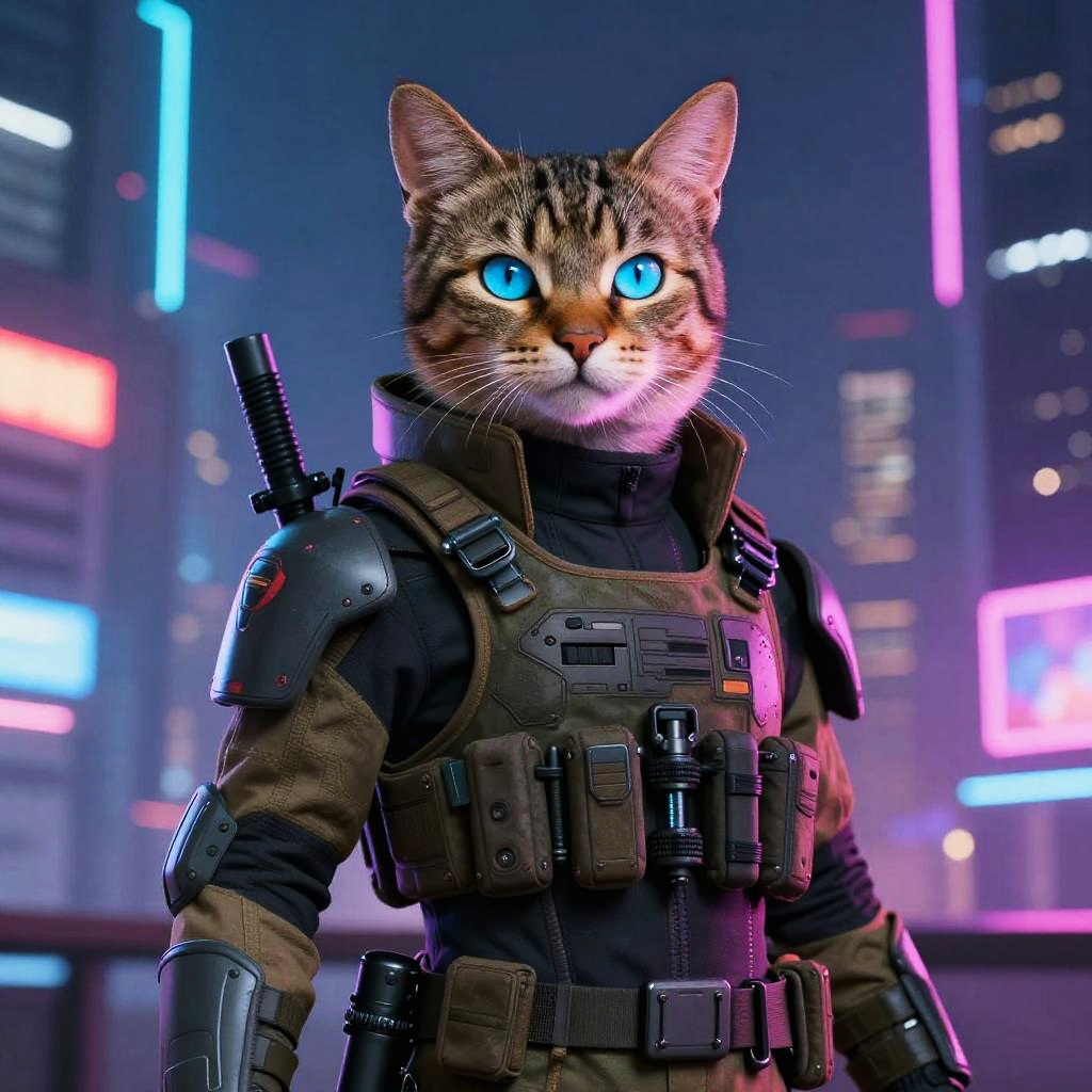 Cyberpunk Cat Soldier in Neon City