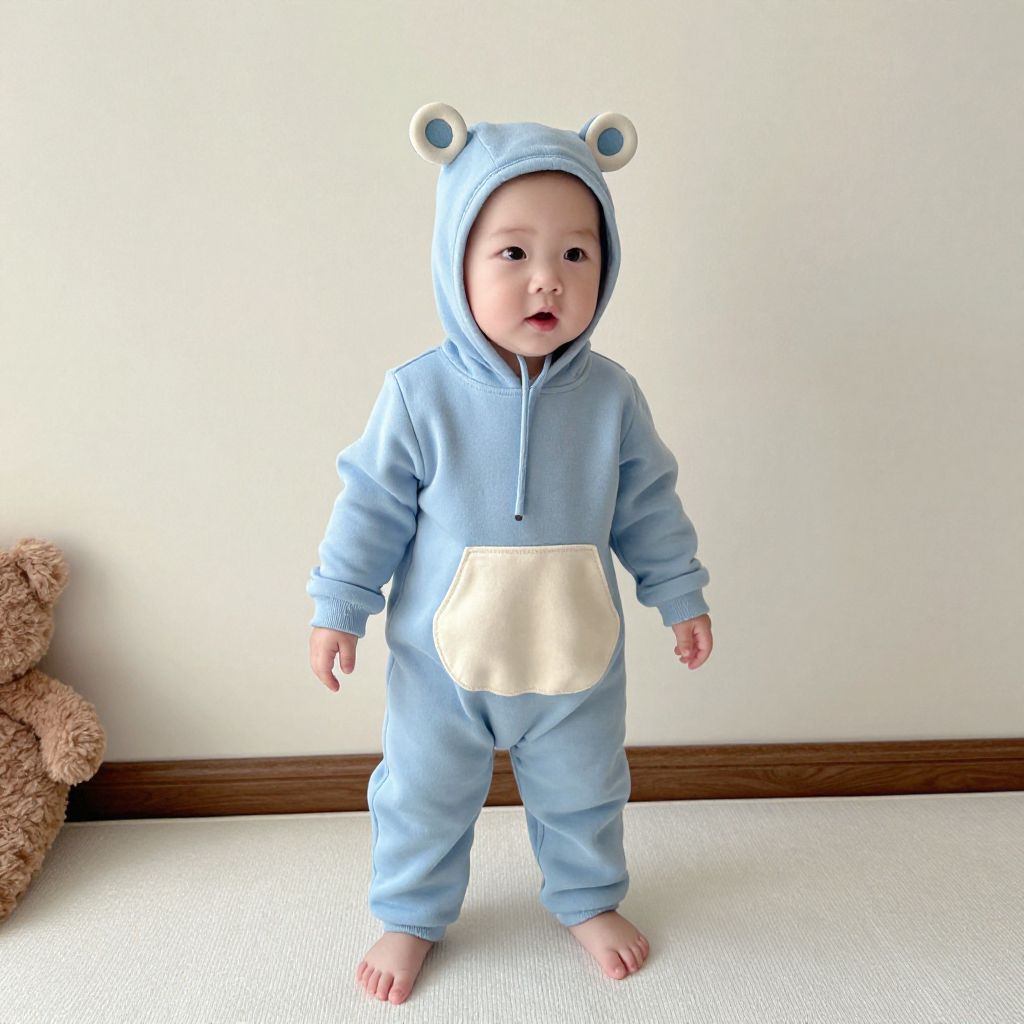 Photograph of a baby with light skin, wearing a light blue bear-themed onesie with white ears, standing on a white carpet against a white wall