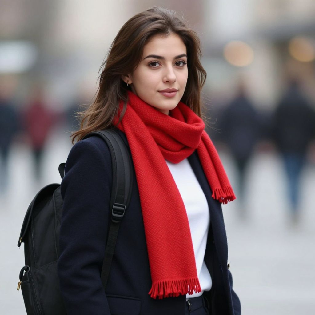 Photograph of a young woman with medium-length, dark brown hair and light skin, standing outdoors in a blurred urban setting. She wears a black coat, white shirt, and bright red scarf with fringed ends, which stands out against her dark coat. She carries a black backpack. Her expression is neutral, with slightly parted lips and dark, well-defined eyebrows. The background is out of focus, featuring indistinct figures and muted colors, suggesting a busy city street. The overall composition highlights her vibrant scarf and casual winter attire.