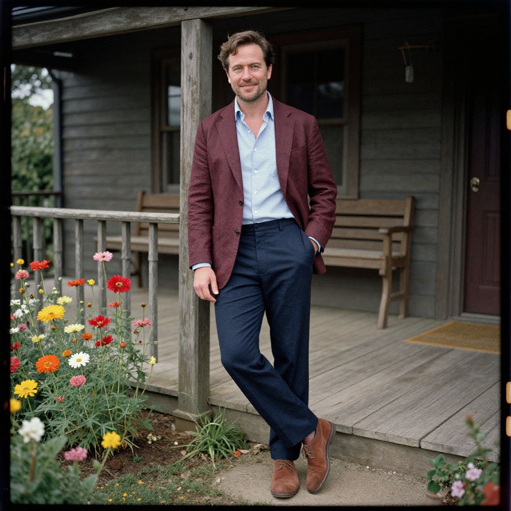 Photograph of a Caucasian man with light brown hair and a trimmed beard, standing on a wooden porch. He wears a dark burgundy blazer, light blue button-up shirt, and dark navy pants, with brown leather shoes. He leans casually against a wooden post, smiling slightly. Behind him, the porch features wooden chairs and a dark wooden door. In the foreground, there's a vibrant flower bed with red, yellow, white, and pink flowers. The porch is surrounded by greenery. The overall setting is rustic and serene, suggesting a countryside location.