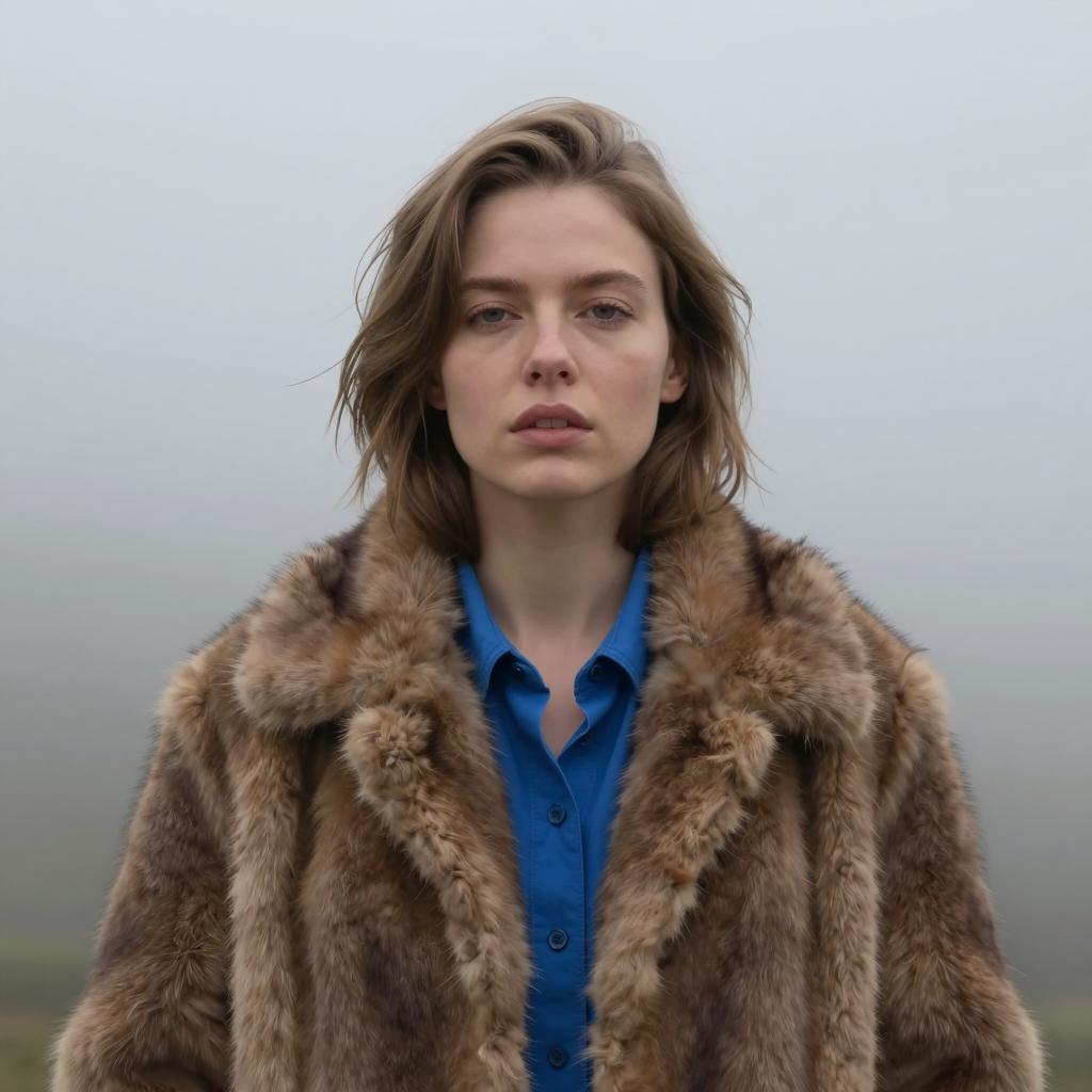 Woman with short, light brown hair, wearing a brown fur coat over a blue shirt, against a foggy background. She has light skin, slightly parted lips, and a neutral expression. Background is uniformly gray with no distinct features.