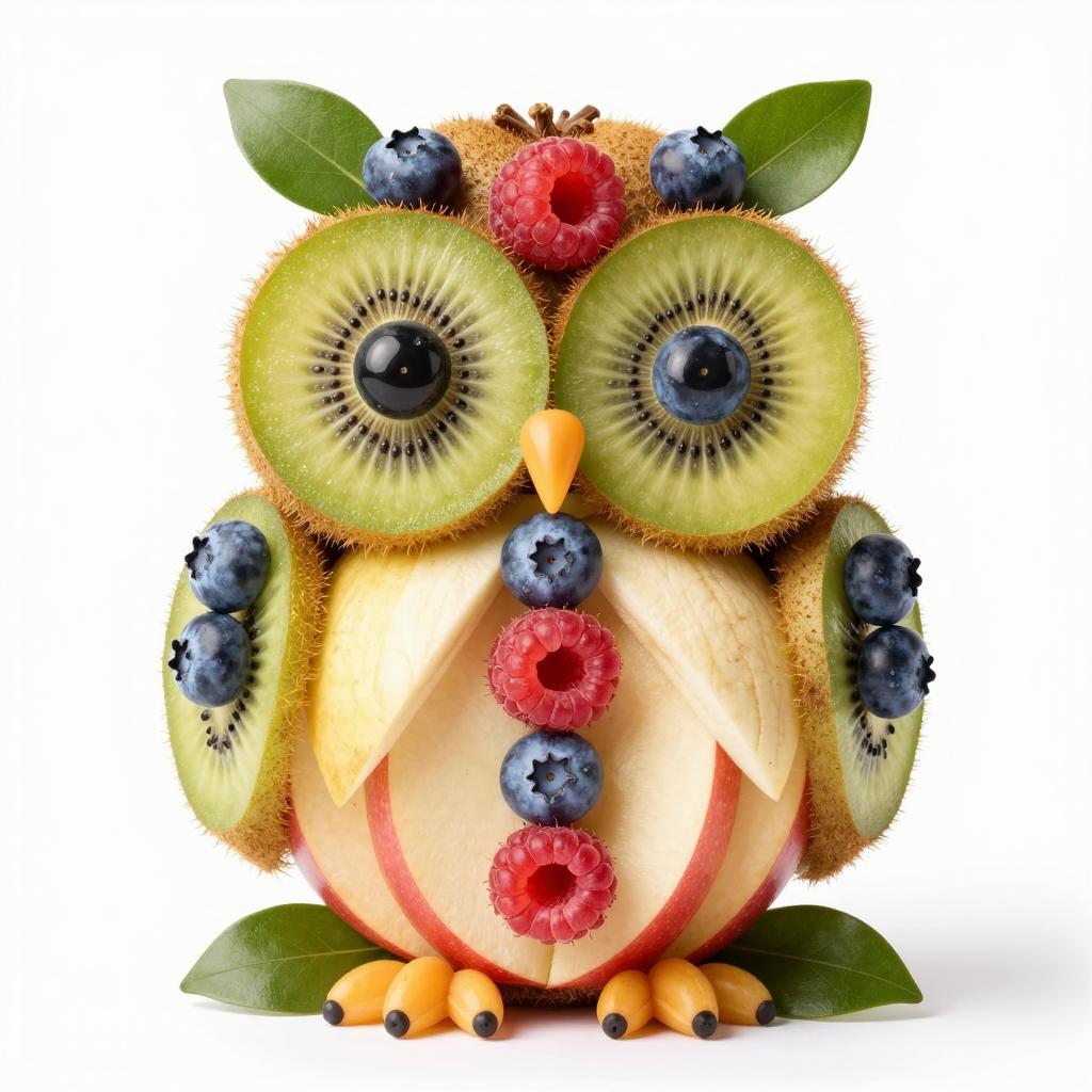 Creative owl sculpture crafted from a variety of fresh fruits including kiwi, golden kiwi, blueberries, raspberries, apple slices, banana, and garnished with green leaves. The fruit arrangement forms the owl's eyes, wings, beak, and body, showcasing vibrant colors and intricate design, ideal for healthy food displays or decorative presentations.