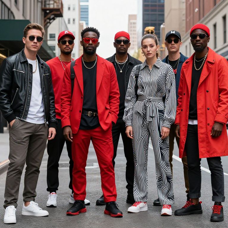 Trendy street style accessories on a diverse group of urban individuals, showcasing bold colors and unique patterns in a high-contrast cityscape setting.