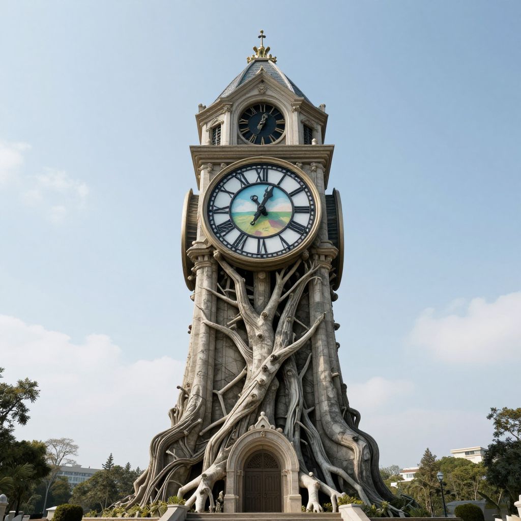 A colossal clock tower emerges from the earth like a gnarled tree, its stone facade intertwined with skeletal branches, while its massive faces display timeless Roman numerals against a serene, otherworldly landscape.