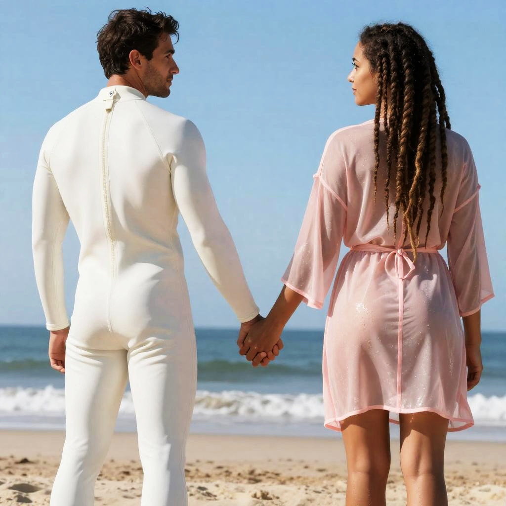 Photograph of a man and woman standing on a sandy beach holding hands. The man is wearing a white wetsuit with a back zipper, facing left and looking at the woman. The woman has long dreadlocks and is wearing a sheer pink wet robe tied at the waist, facing right with her back to the camera. The background features the ocean waves and blue sky.