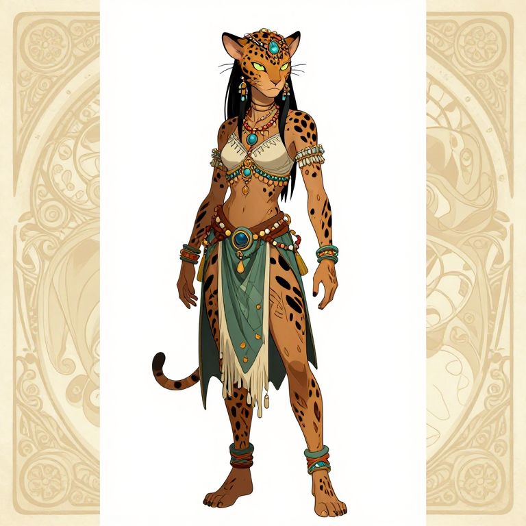 A detailed 2D anime character design featuring a tribal alien-scifi fantasy traveler, dressed as a Panther witch, with intricate patterns and jewelry, created by Mike Mignola and Alphonse Mucha, in digital art form, centered in the image.