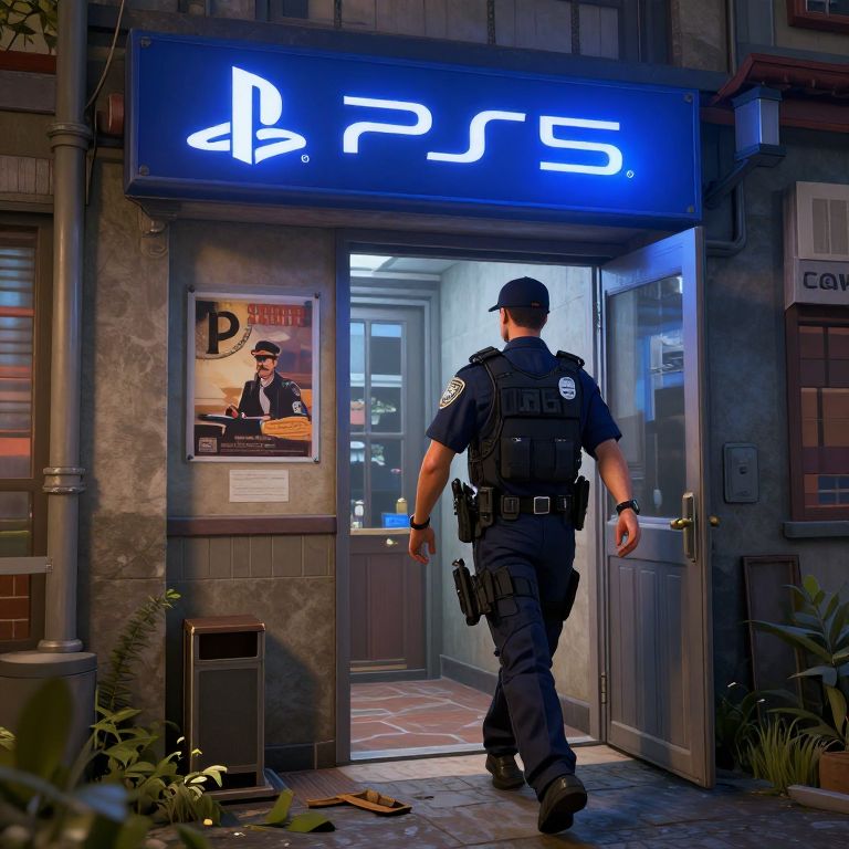 Adventure a police officer walking into a small residential building, poster art by Adam Pijnacker, cgsociety, computer art, playstation 5 screenshot, cryengine, artstation hd, blue lights,