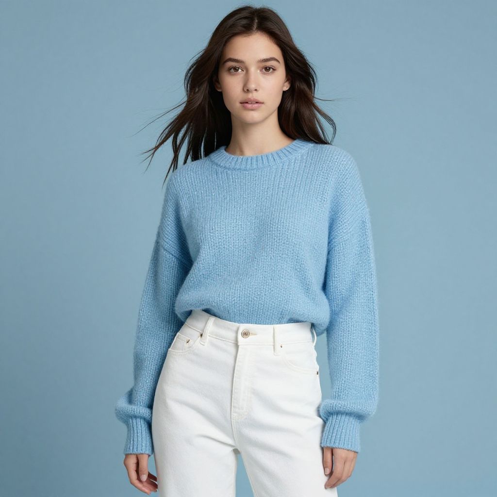 A young woman poses confidently against a soft blue background, wearing a cozy, oversized light blue knitted sweater paired with high-waisted white pants. The image highlights a modern, minimalist fashion style with natural makeup and flowing dark hair, capturing a relaxed yet elegant look.