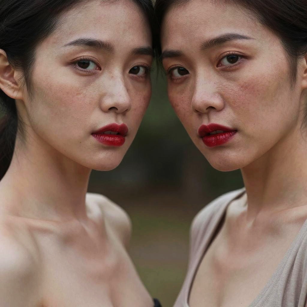 Close-up portrait of two Asian women with clear skin, freckles, and shiny red lips. Both women have dark hair pulled back, natural makeup highlighting their facial features including detailed eyes and subtle acne on forehead. They are dressed in neutral-toned clothing with one wearing long sleeves. The image is photographed outdoors with a blurred background emphasizing depth of field and focusing on their expressive faces looking directly at the camera.