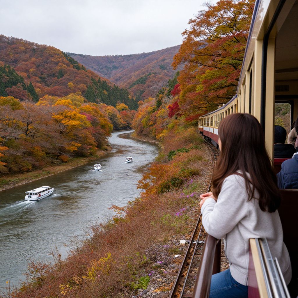Woman enjoying a scenic autumn journey aboard a trolley train, gazing out at vibrant fall foliage and a serene river dotted with boats, as the colorful landscape unfolds along Watarase Gorge.
