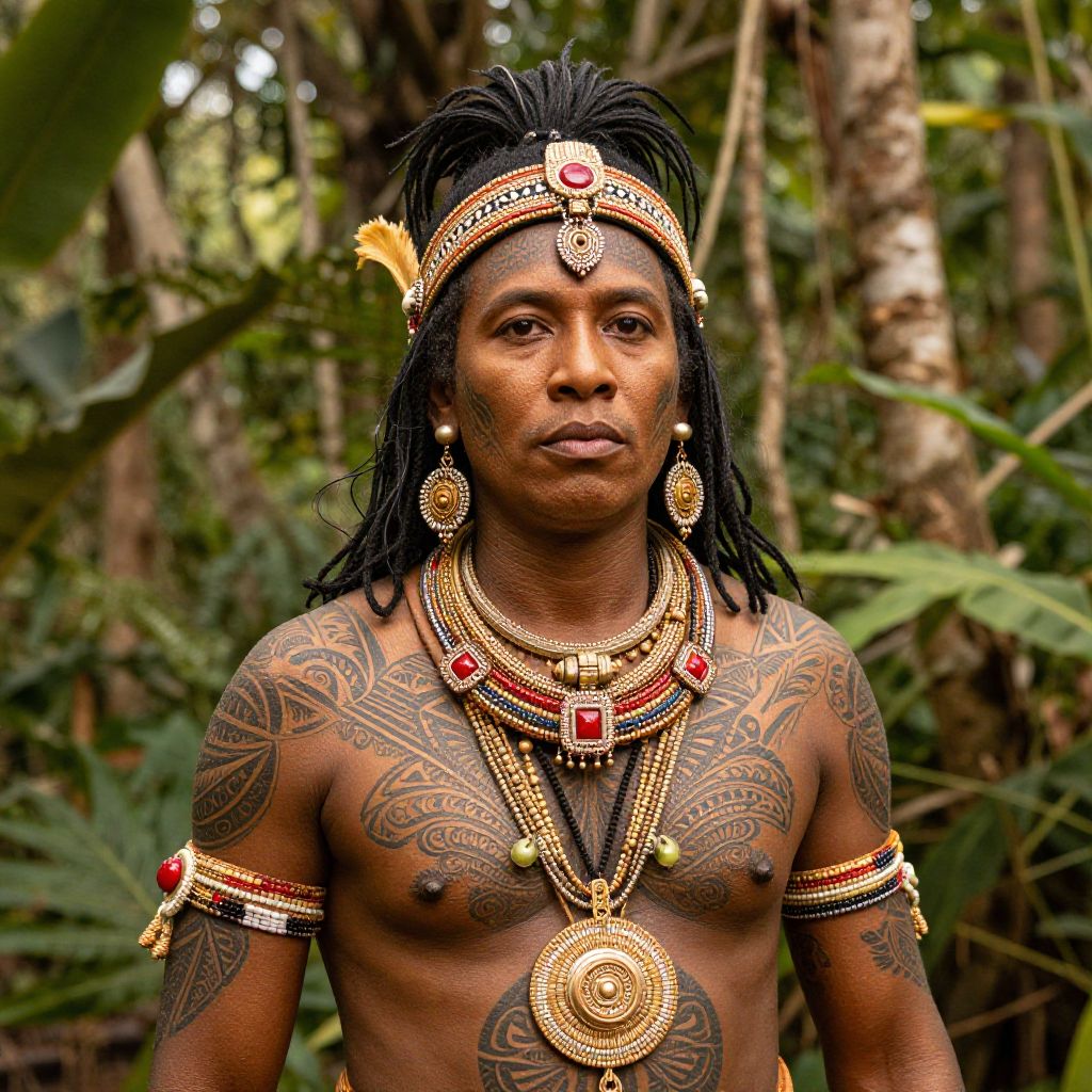 Photograph of a shirtless, dark-skinned man with black dreadlocks standing in a lush jungle. He wears elaborate traditional gold and red jewelry, including a headpiece with a yellow feather, large circular necklaces, and arm bands. His chest and shoulders are adorned with intricate tattoo designs. His serious expression contrasts with the vibrant, green, and brown forest background. The image is rich in color and detail, highlighting the cultural and natural elements. The man's physique is muscular, and his tattoos are prominently visible. The lighting is natural, enhancing the textures and colors.
