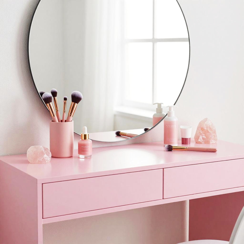 Vibrant pink self care aesthetic with a modern vanity table, elegant makeup brushes, moisturizers, rose quartz crystals, and minimalistic decor in a bright, airy room