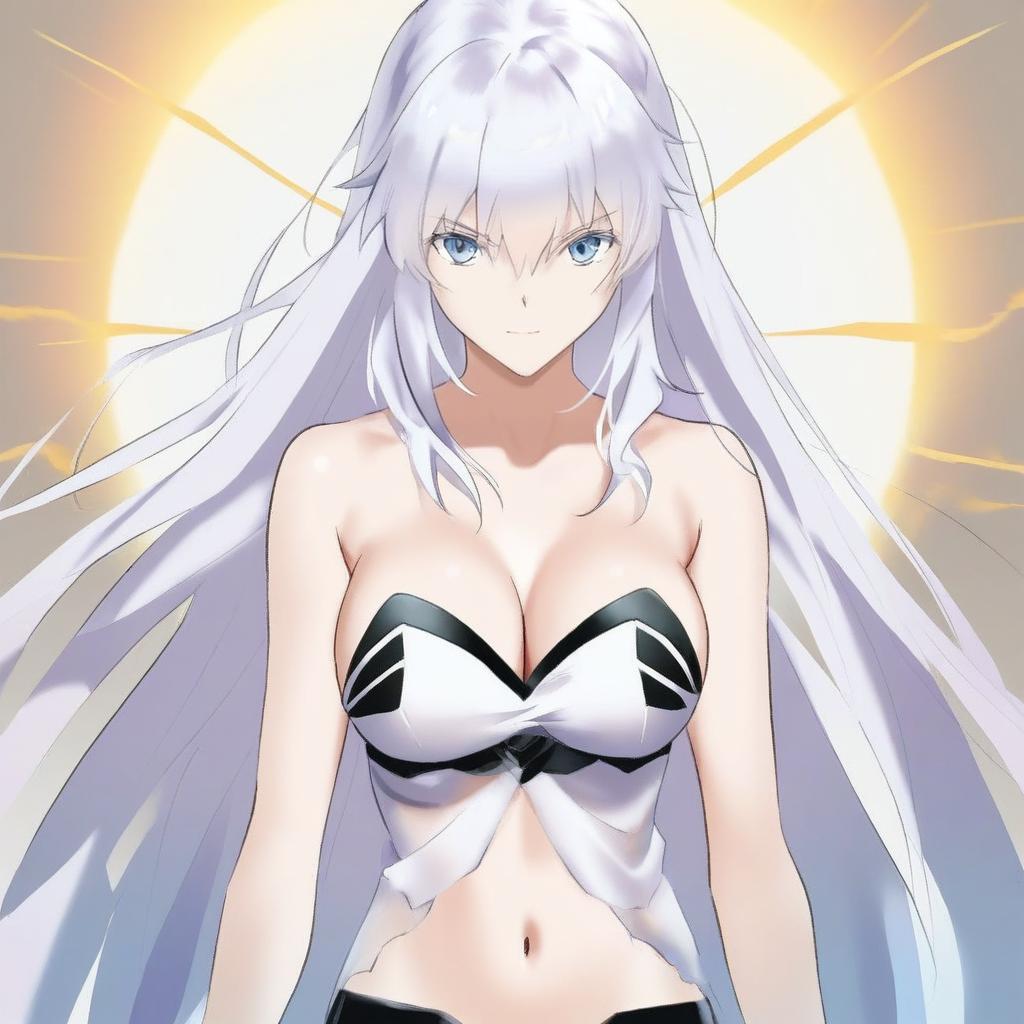 Artemis (fate), fate/grand order, 1girl, blue eyes, hair between eyes, long hair, white hair, very long hair, large breasts, cleavage, navel, bare shoulders, by artist houzuki (hotondo), leet