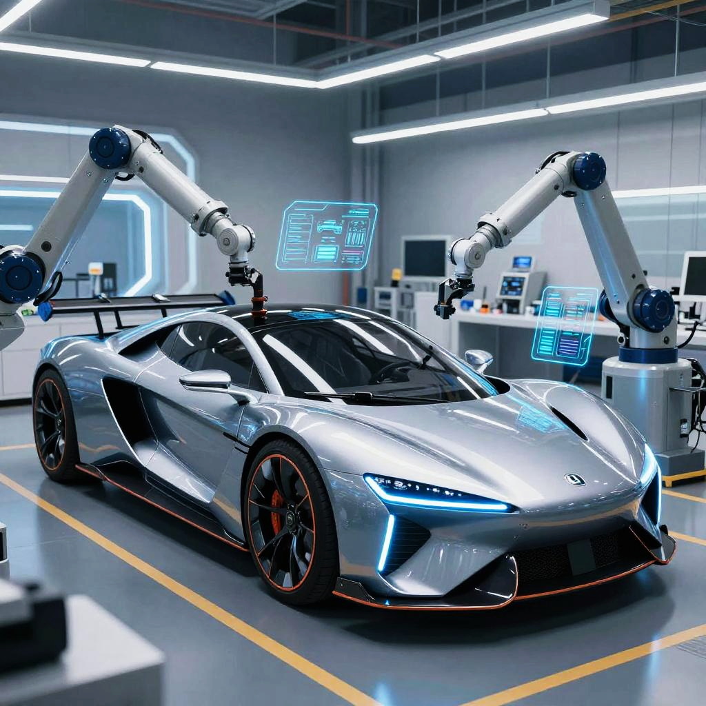 AI vehicle generator creating futuristic cars in a high-tech workshop, sleek aerodynamic designs with glowing neon accents, holographic interfaces and robotic arms assembling vehicles, ultra-modern factory setting, vibrant blue and silver color palette