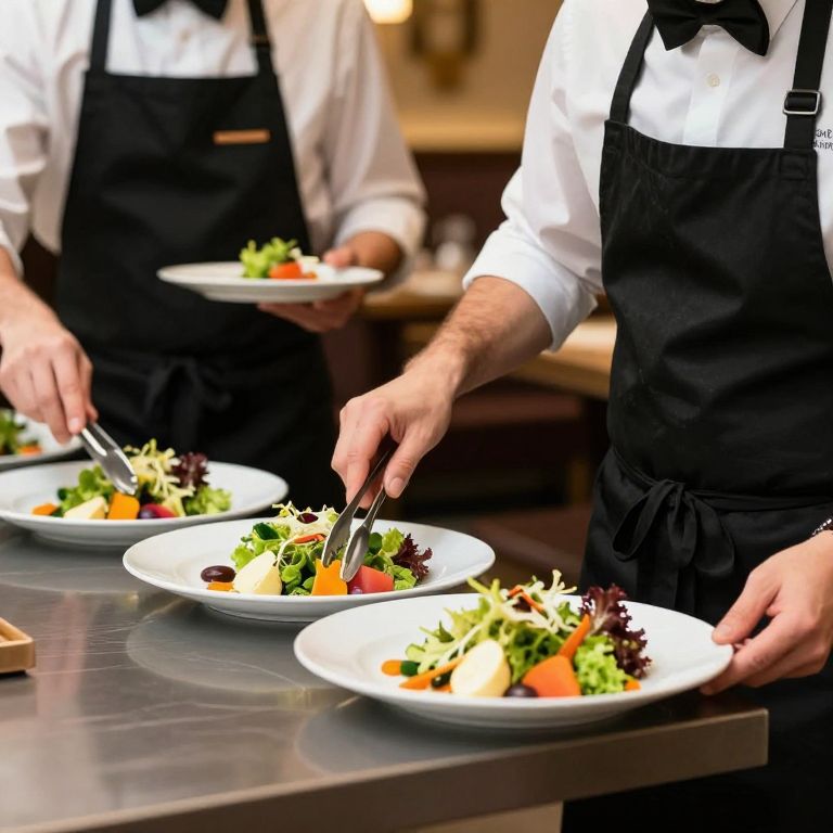 Two catering staff members, both wearing white shirts and black aprons, are meticulously plating vibrant salads featuring fresh greens, colorful vegetables, and garnishes, with one person using tongs to arrange ingredients while the other assists, all set against a warm, inviting restaurant backdrop.