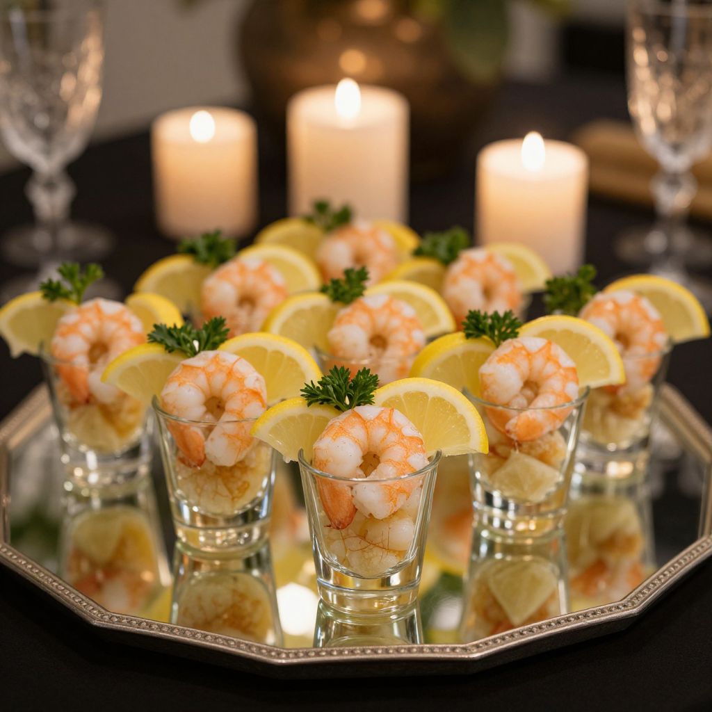 Elegant appetizer scene showing delicate shrimp cocktails in small glass cups garnished with fresh lemon wedges and parsley, placed on a mirrored tray with candles in the background, evoking a luxurious and festive ambiance perfect for a classy event.