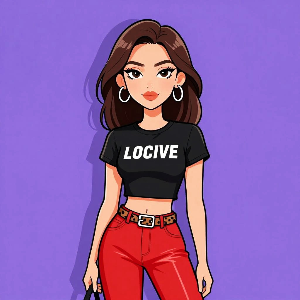 Digital illustration of a young woman with brown hair, wearing a black "LOCIVE" crop top, red pants, hoop earrings, and a brown belt