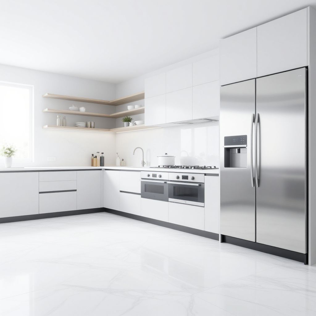 Kitchen with white marble floor, modern minimalist design, sleek stainless steel appliances, bright natural lighting, clean lines, open shelving, elegant and airy ambiance