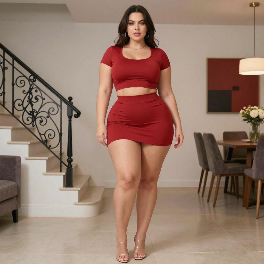 Photograph of a curvy Latina woman with long brown hair, wearing a yellow halter top and matching high-waisted shorts. She stands confidently, leaning against a wall with green vines, in a brightly lit room with brick walls and large windows.