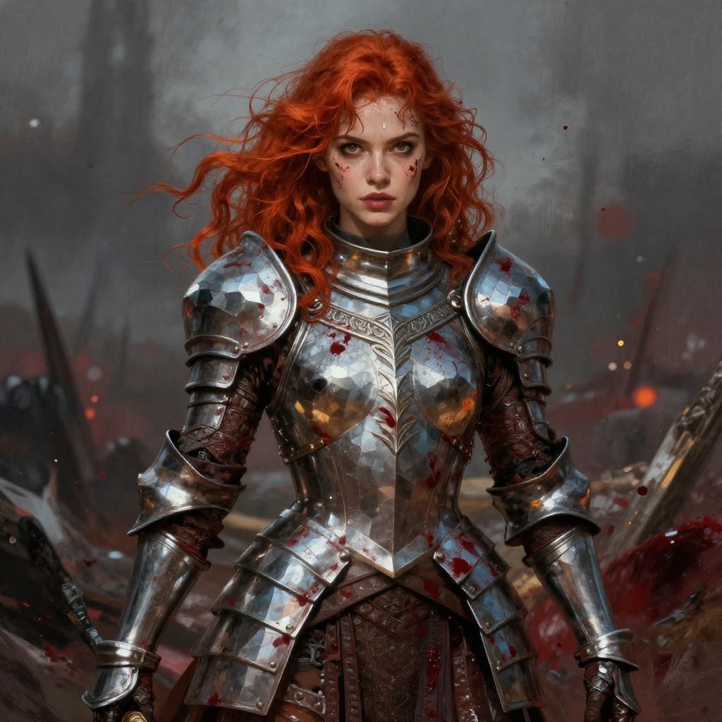 Digital artwork of a fierce, red-haired woman with wavy hair, wearing heavily blood-stained, silver medieval armor with intricate patterns. She stands amidst a chaotic battlefield, with dark, smoky background and scattered debris, including broken armor and red embers. Her intense green eyes and determined expression convey strength and resilience. The armor's reflective surfaces contrast with the dark, gritty surroundings, highlighting the damage and battle scars. The overall style is hyper-realistic with dramatic lighting and detailed textures, emphasizing the gritty, intense atmosphere of the battlefield.