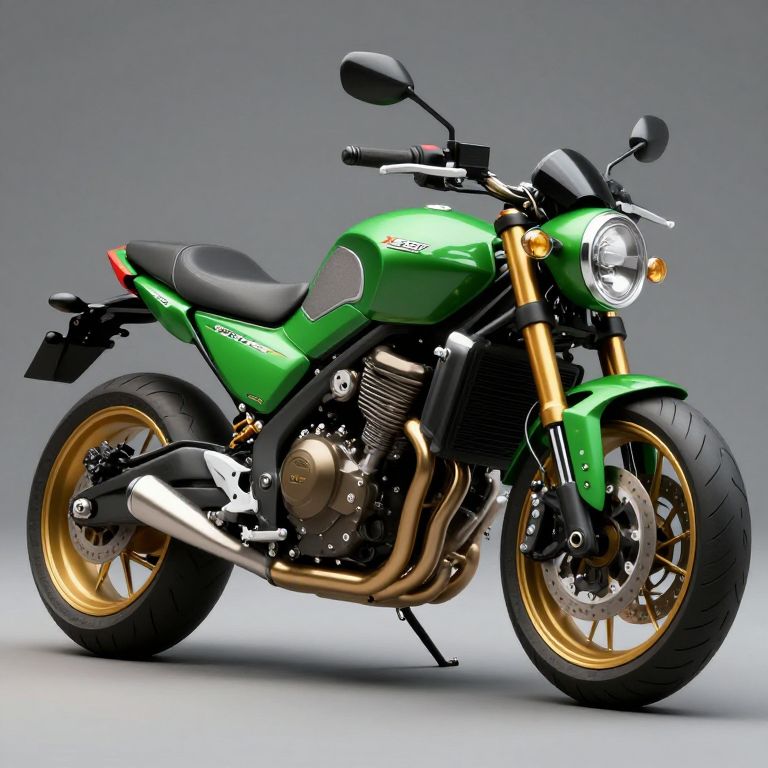 A sleek Buell X1 Lightning motorcycle by K-Speed Hell Kustom, rendered in a high-definition 3D style with a striking green and gold color scheme, featuring custom modifications and dramatic lighting effects that highlight its bold, retro-inspired design.