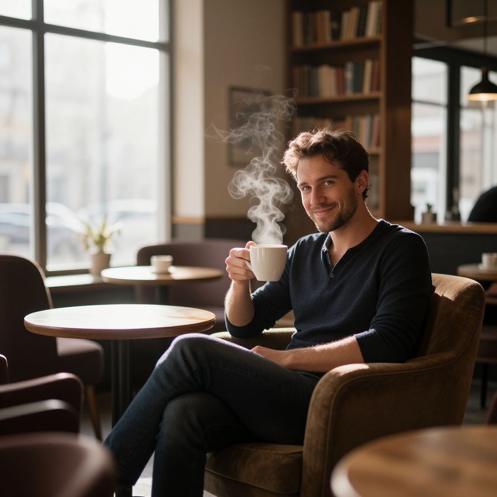 Cozy coffee shop scene, soft morning light streaming through large windows, wooden tables and chairs, plush armchairs, vintage bookshelves, aromatic scents of freshly brewed coffee wafting through air, man sitting comfortably with steaming cup in hand, warm smile on his face, relaxed atmosphere, high-resolution iPhone photo, shallow depth of field Man has masculine face and piercing eyes