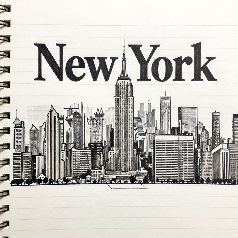Hand-drawn skyline of New York City's Manhattan, featuring iconic skyscrapers and bold lettering spelling \"New York,\" rendered in black ink on lined sketchbook paper with spiral binding details.