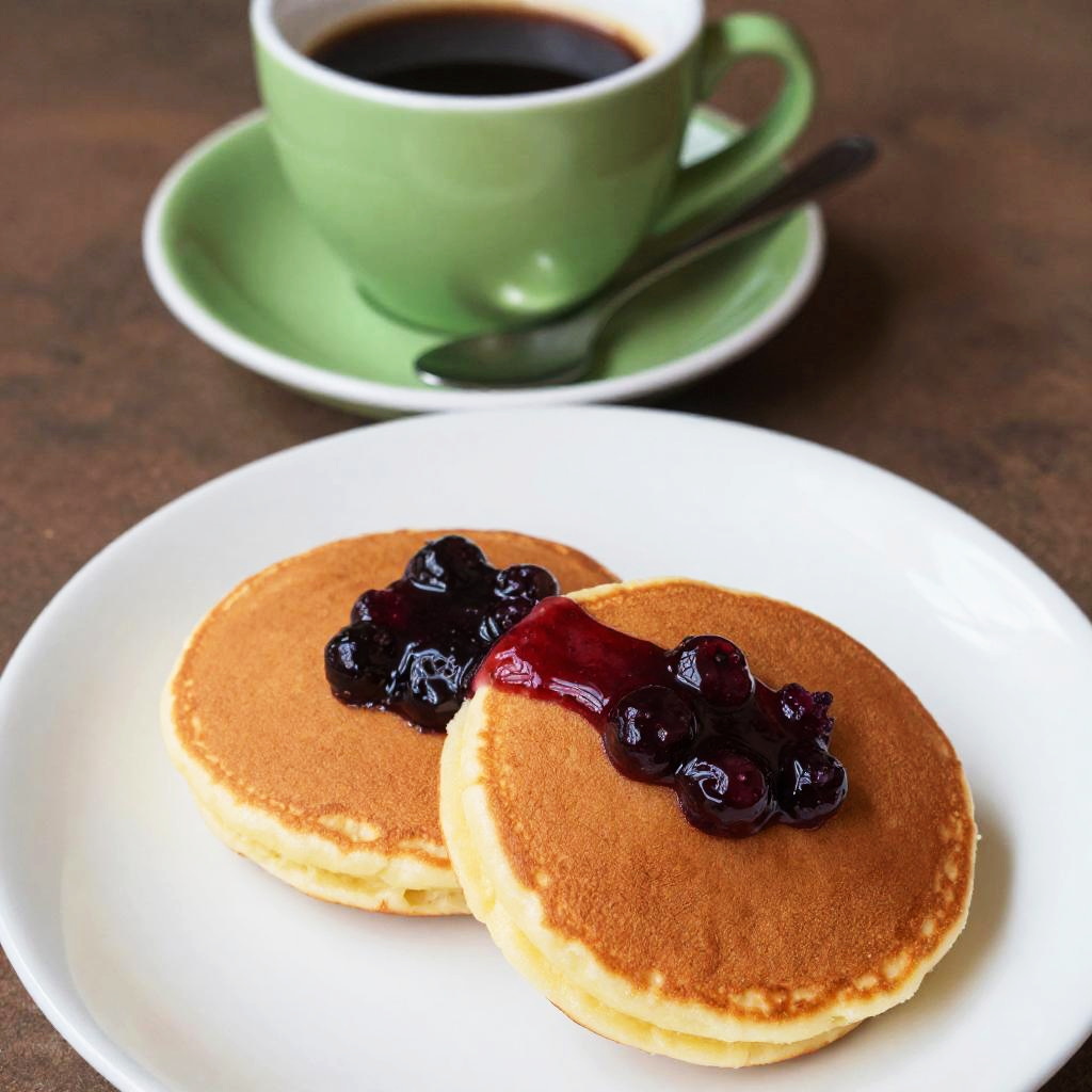 Photograph of two golden-brown pancakes topped with dark purple blueberries and red berry jam, in front of a green cup of black coffee on a