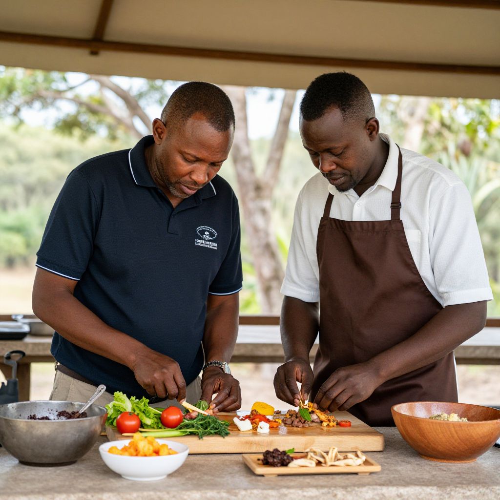 Two men engage in a culinary demonstration at the Interactive Kitchen of &Beyond Lake Manyara Tree Lodge, with one wearing a dark polo shirt and the other in a white shirt and brown apron, both focused on preparing food items displayed on a wooden cutting board alongside fresh vegetables and a bowl of ingredients.