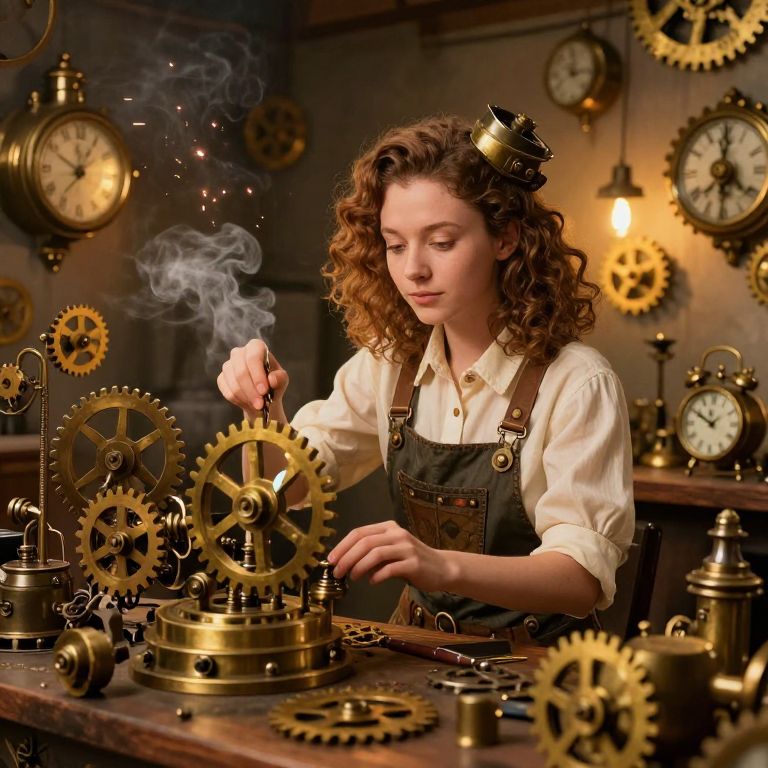 Steampunk photograph of a curly-haired woman in overalls, adjusting brass gears with smoke, surrounded by vintage clocks in a dimly lit workshop.