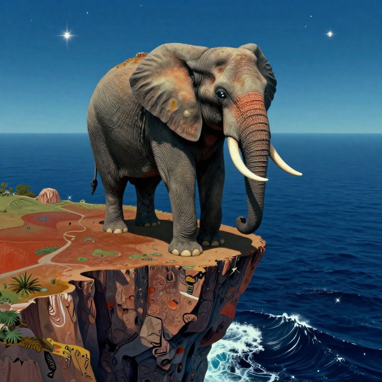 In a surreal landscape reminiscent of Dalí's iconic works, envision an aerial view of a majestic elephant poised on a precarious precipice above the vast expanse of an ocean. The creature's wise eyes reflect the shimmering stars overhead, evoking both wonder and unease as it appears to defy gravity, standing resilient against the turbulent waves below—a testament to its indomitable spirit. Rich, velvety colors and distorted geometry interplay in this captivating image, creating a mesmerizing visual symphony that invites viewers on an emotional journey between reality and fantasy.
