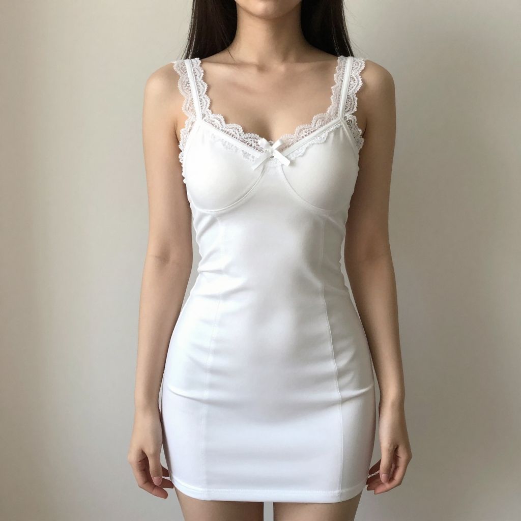 1girl, solo, (dress tug:1.2), white dress, lace trim, medium breasts