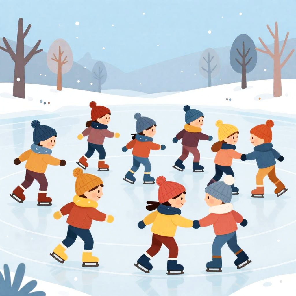 Digital illustration of two brown horses with blue accents, pulling a red sleigh with two people. The driver, a blonde woman in a red hat and black coat, smiles. The passenger, a pink-haired woman, looks forward. Snow-covered path with white, leafless trees in the background. Yellow sky. Horses' manes are dark brown.