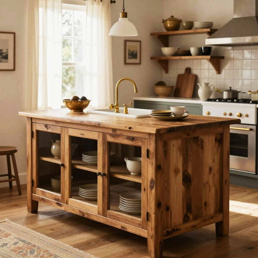 Rustic kitchen island with glass doors, reclaimed wood finish, farmhouse sink, vintage brass fixtures, cozy open shelving displaying ceramics, soft sunlight filtering through sheer curtains