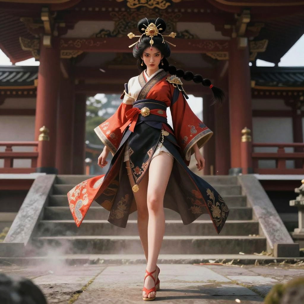 Photorealistic CGI of an Asian woman in traditional red and black kimono, with intricate gold patterns, braided hair, and ornate headpiece