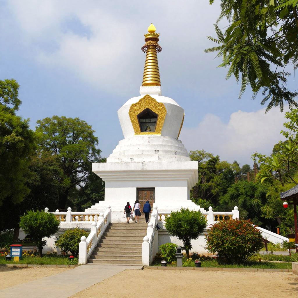 Photograph of a white Buddhist stupa with a golden spire, located in a lush, green garden. The stupa has multiple white structures and a wide staircase leading up to it, with a few people climbing the stairs. Surrounding the stupa are vibrant green trees and bushes, and a sandy pathway in the foreground. The sky is partly cloudy, adding depth to the scene.