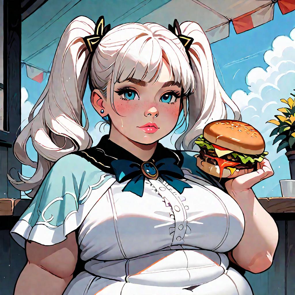 Score_9, score_8_up, score_7_up, score_6_up, score_5_up, score_4_up, highly detailed, an obese frieren eating a burger at mcdonalds, twintails, wearing a white dress and capelet