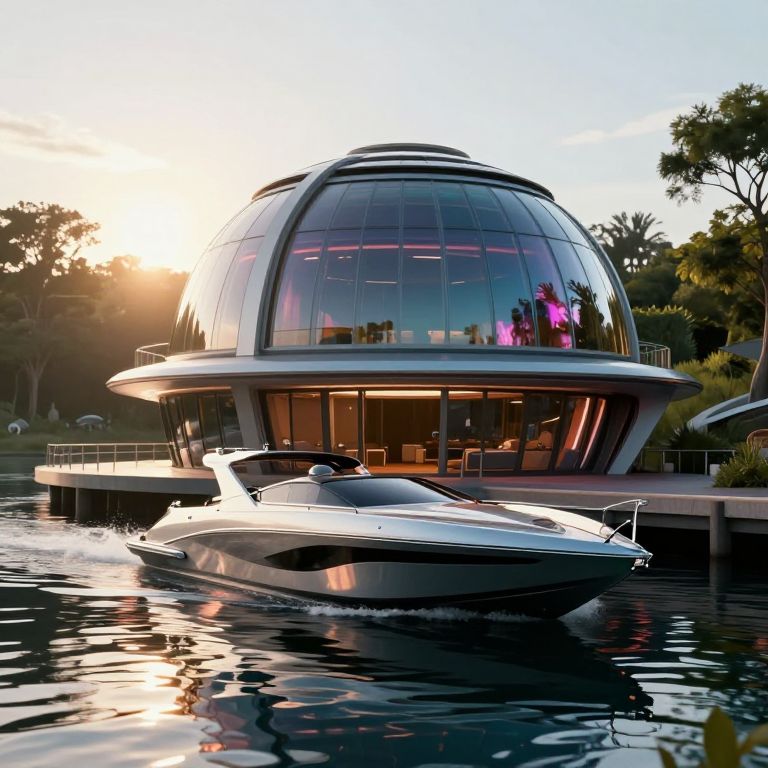 The image depicts a futuristic boathouse with a luxury speedboat pulling up to it on a sunny day. The boathouse features a modern, architectural design with large glass windows and a prominent dome, reflecting the vibrant, artgerm lighting. The boat, with its sleek, aerodynamic shape and metallic finish, is positioned in the foreground, casting a reflection on the calm water. The scene is illuminated by volumetric lighting, creating a dramatic and cinematic atmosphere. The boathouse and boat are centrally located, with the sun shining from behind, casting a warm glow and creating a high-contrast, dynamic lighting effect. The overall composition is highly detailed and realistic, with a focus on texture and depth of field, giving the image a sense of realism and depth. The boathouse and boat are the main subjects, with the surrounding trees and water providing a natural and serene backdrop. The image is shot with a 35mm lens, using Unreal Engine, and features advanced post-production techniques such as Ray Tracing and Global Illumination, resulting in a highly detailed and realistic rendering.