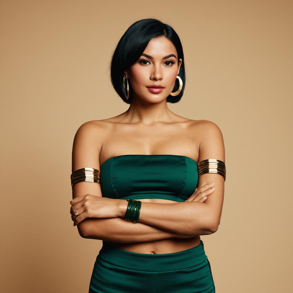Portrait of an olive-skinned woman with a sleek black bob hairstyle wearing a minimalist deep emerald green bandeau tube top. She is accessorized with layered delicate necklaces featuring green and gold tones and small stud earrings. The model is posed with one hand touching her neck and the other resting near her waist against a high-key white background with soft, even studio lighting.