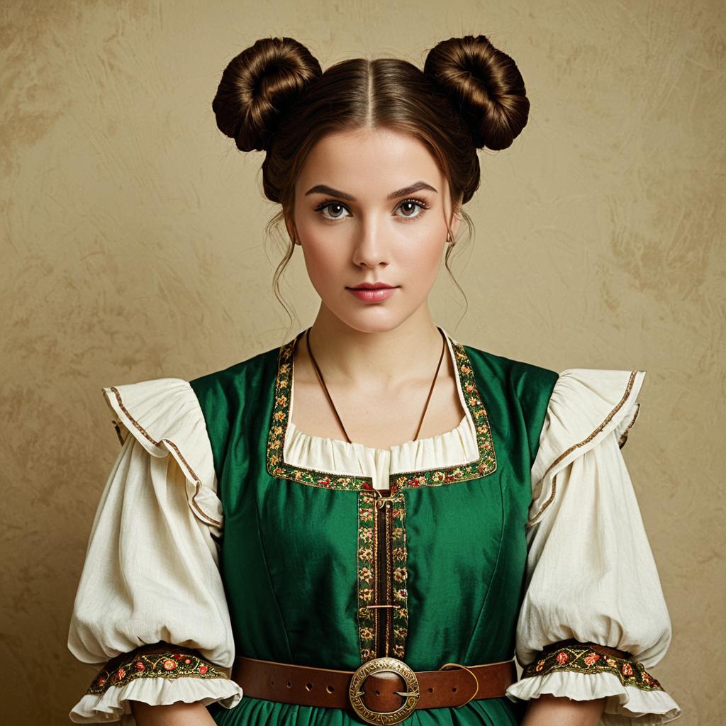 Costume woman funny, portrait, young woman, medieval-style dress, green dress, brown belt with circular buckle, white ruffled sleeves, intricate embroidery, brown hair in two buns, fair skin, brown eyes, neutral expression, subtle makeup, soft lighting, beige background, classic painting style, realistic, detailed ures, photograph-like, traditional fashion, historical clothing, vertical orientation, centered subject, traditional portrait frame