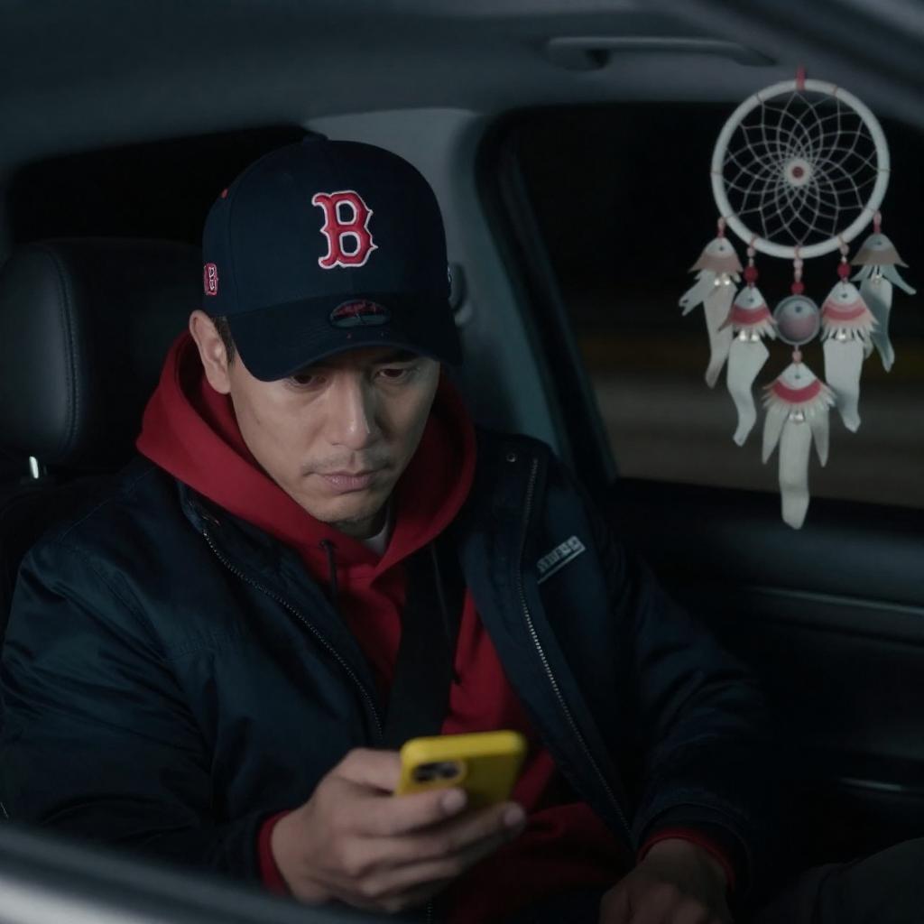 Photograph of a man in a black Boston Red Sox cap, leaning forward in a car at night. He wears a dark jacket with a red scarf, holding a yellow object. Intense, focused expression. Car interior visible. Text "Dreamcatcher" in upper right. Blue and black color palette.