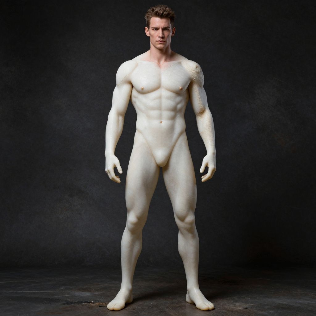 Drawing Ink muscular handsome man, but his skin is grafted by alabaster, science fiction style, high definition, detailed, photo relastic, full body, dark gritty background, full color,