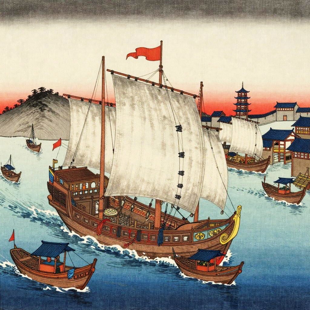 Ukiyo-e Ink Painting of Chinese Junk Fleet